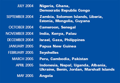 From July 2004 to May 2005, PSMP! tournaments were held in thirty one nations, and prizes were awarded, with WANGO members and affiliated NGOs coordinating the tournaments. Aminimum of eight teams participated in each country's project, sometimes more. In Gaza, there were sixteen teams representing all the supporting factions.